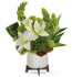 - This artistic arrangement includes white asiatic lilies, green cushion spray chrysanthemums, bells of Ireland, a large green echeveria succulent, variegated aspidistra leaves, and galax leaves.