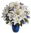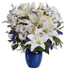 - Blooms such as crème roses, graceful white oriental lilies, white alstroemeria, a white disbud mum, purple statice and lavender limonium are accented by seeded eucalyptus and salal in a stunning cobalt blue glass vase.
