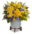 - Radiant yellow roses, yellow alstroemerias, yellow button spray chrysanthemums, and blue sinuata statice are accented with solidago, lemon leaf, leatherleaf ferns. Delivered in Teleflora's Classic Contemporary Planter.