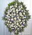 - Standing spray arrangement with white roses, Asiatic lilies, football mums, carnations and monte casino; blue delphinium; accented with soft, lush greenery