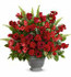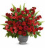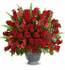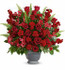 - Red roses, red alstroemeria, red carnations, miniature red carnations, and burgundy stock are arranged with spiral eucalyptus, seeded eucalyptus, sword fern, and lemon leaf.