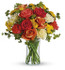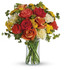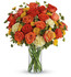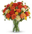 - Dark orange, orange and coral roses are gathered with light yellow carnations, yellow button mums and fresh green bupleurum and pittosporum in a simple glass gathering vase.