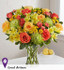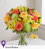 - All-around arrangement with yellow and orange roses, yellow Peruvian lilies (alstroemeria) and button poms, orange mini carnations, green spider mums; accented with assorted greenery