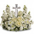 - A fragrant mix of pure white blooms - including roses, alstroemeria, stock, carnations and waxflower - is accented with dusty miller and variegated pittosporum around an exclusive Crystal Cross keepsake.
