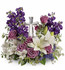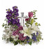 - Lavender roses, white asiatic lilies, white alstroemeria, purple stock and purple seafoam statice are arranged with fresh pitta negra, seeded eucalyptus and lemon leaf. Delivered with a Crystal Cross keepsake.