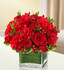 The symbol of courage and strength, an all-red bouquet conveys your sympathies with striking beauty. Our florists fill a stylish cube vase with roses, spray roses, Gerberas, carnations and more to send a fitting tribute during times of sorrow.