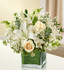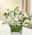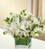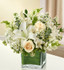 Elegant white flowers help to convey your deepest sympathies with graceful beauty that heals the soul. Our lovely cube vase arrangement offers a lasting tribute to friends and family members, crafted from fresh roses, lilies, snapdragons, monte casino and more.