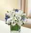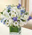 Send your deepest care and concern during times of sorrow with our precious blue and white sympathy arrangement. The freshest roses, delphinium, lilies, daisy poms and carnations are hand-designed in a stunning cube vase as a gesture of comfort and peace.