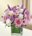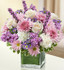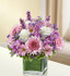 Let the comforting beauty of elegant lavender and white blooms send a caring message of your sympathies. Lovely roses, stock, liatris, cremones, carnations and more are gathered by hand in a classic cube vase and sent to the home or service to honor lost loved ones.