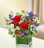 This lovely red, white and blue sympathy arrangement offers a beautiful reflection of your patriotism, sympathy and support. Fresh red roses, delphinium, stock, carnations and hypericum, designed in a cube vase, provide a stunning tribute sent to the home or service.