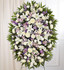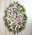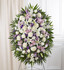 - Standing spray arrangement with lavender daisy poms, stock and monte casino; white roses, Oriental lilies, football mums, gladiola and carnations; purple statice; accented with soft, lush greenery