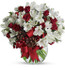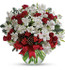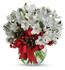 - White alstroemeria and Douglas fir are mixed with pinecones and red berries in a clear bowl decorated with red satin ribbon.