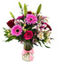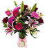 "Love and Romance" Bouquet is a meticulously crafted floral arrangement designed to express deep love and passion. Featuring a mix of red and hot pink roses, stargazer lilies, pink gerbera daisies, pink alstroemeria, and purple waxflower, it combines beauty and fragrance in one stunning package. Presented in a clear glass vase with a pink satin ribbon, it's the perfect gift to ignite romance, celebrate anniversaries, or declare your affection for someone special.