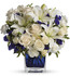 Like gazing into a clear blue sky, this serene arrangement soothes the soul and cheers the heart. Its creamy roses and snowy lilies are arranged in our dazzling sapphire cube.