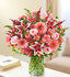 - Lush bouquet of the freshest pink roses, lilies, snapdragons, Gerbera daisies, carnations, alstroemeria and heather, accented with variegated pittosporum, salal and myrtle