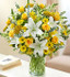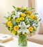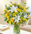 An elegant expression of your care and concern, our abundant arrangement of roses, lilies, snapdragons, yarrow, alstroemeria and more in bright and beautiful yellow and white offers a comforting tribute during times of sorrow.