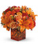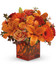 - Orange gerbera daisies, orange roses and red mini carnations are accented with a spray of red huckleberry in an orange cube vase.