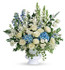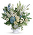 Honor the memory of your beloved with this breathtaking bouquet of sky blue hydrangea and cloud white roses in a classic white urn.