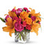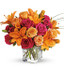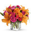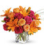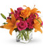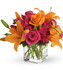 - Orange asiatic lilies, hot pink and light orange roses, miniature red carnations and a bit of understated greenery.