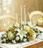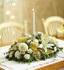 - Fresh centerpiece arrangement of white roses, carnations, lilies and mini carnations, supported and accented by fresh greenery, seeded eucalyptus and pittosporum and decorated with gold ribbon and ornament balls