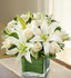 A shining example of style and grace. That's our chic bouquet of striking white roses and white lilies, gathered by hand in a glass cube vase. Perfect for an anniversary, hostess gift, or any event, it's a standout surprise that fills a tabletop or any décor with sophisticated beauty.